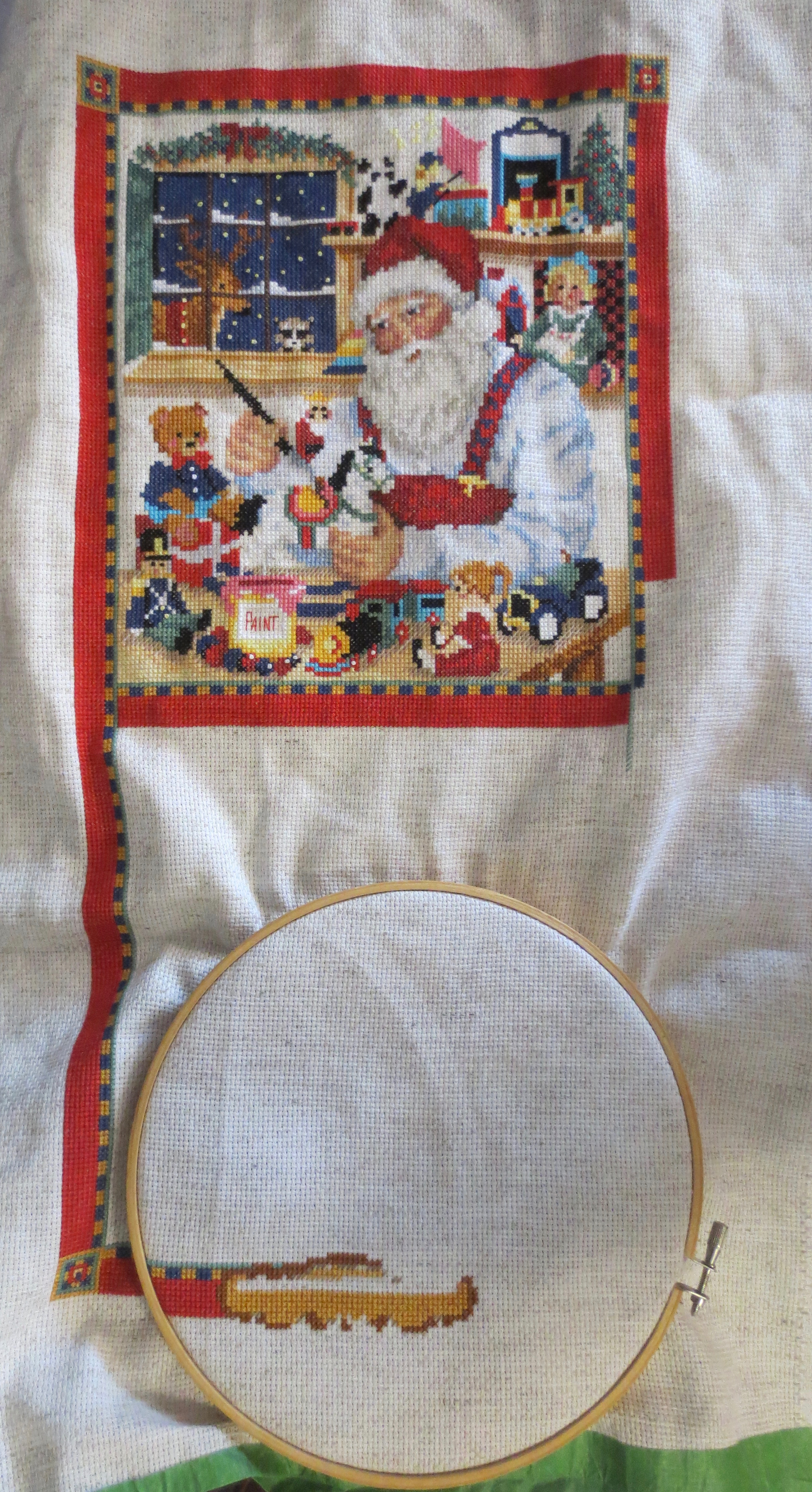 But my afternoon has been filled with cross stitching. I haven’t had a good long session at it for a long time and it is nice to see some real progress. I’d like to be finished the cross stitching on the main body by the end of the month; it looks like it will be tight, but I just might make it.