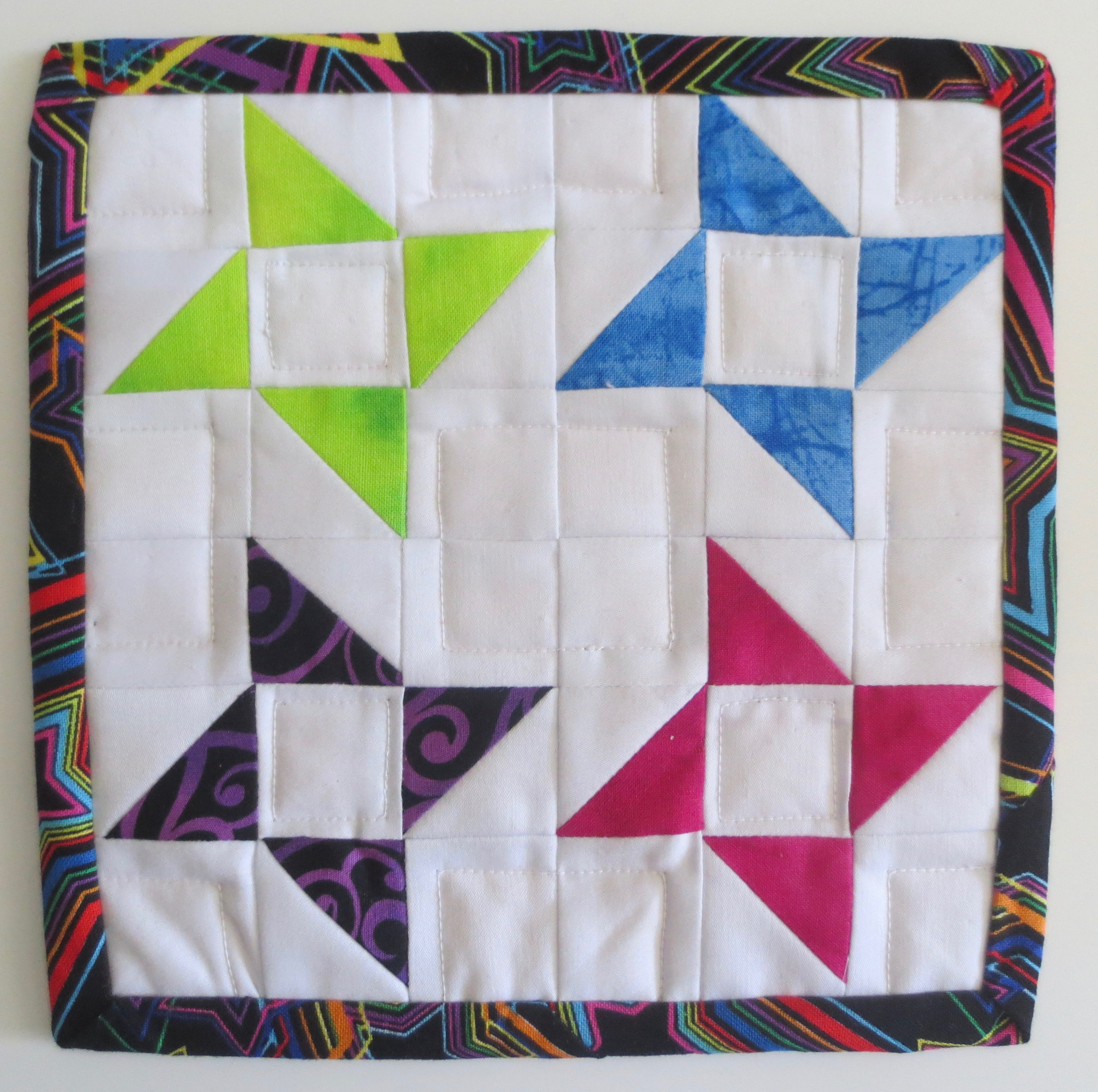 I tell everyone that cousins are the best friends so this seemed an easy choice for Roberta’s birthday. I love pinwheels and anything that looks like a pinwheel so it was fun to make. I did some (almost) straight-line quilting within those tiny squares.