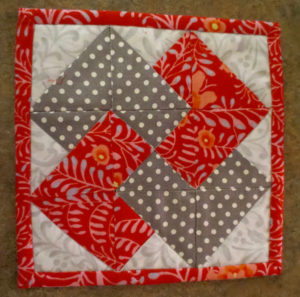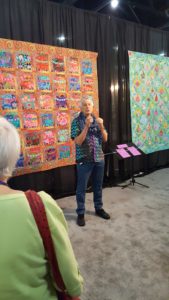I used some of the Kaffe Fassett fabrics that were left from my Farmer’s Daughter blocks. It is lovely to be far enough along that I can start using the scraps. And I never use that line of fabric without remembering how much I enjoyed hearing him speak at the Houston International Quilt Show a couple of years ago.