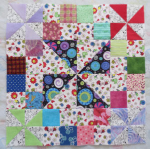 I took a few liberties with my calendar block today. I replaced some half-square triangles with some pinwheels (because I like pinwheels and they were already made and the right size). And I was able to pull all the solid squares from my bin, as well as all the small bug squares. It is very busy, doesn’t look much like the picture but I still like it.