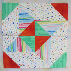 It took me until two this afternoon to get this block finished. I tried to second guess the cutting to avoid the large striped triangles thinking a smaller triangle and half-square triangles would work just as well. So I made my HSTs and my quarter-square triangles and started putting it together. I couldn’t for the life of me make it “come together” so I reversed stitched (about three times), recut fabric (I was lucky I had just enough of the orange and no extra) and still I struggled. Then I realized what my mistake had been. I made my QST squares the same size as the HSTs and I know (now) that they have to be slightly bigger to start. Once that was sorted I managed with the various combinations of cuttings and seams already stitched to get it all together. Biggest surprise of all is that I actually like the block.