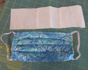 I decided to start with the smallest mask that I make (for Taylor). It went together quite well and is not much more difficult than the original method. I worried about pressing but as long as the filter layer was between two fabric layers it didn’t melt. My quilting experience came in handy as putting the layers together was done the same as my cards, and I’ve had lots of practice with them. Pleating is a little more difficult and sewing the pleats down is a bit tough but not too much of a problem.