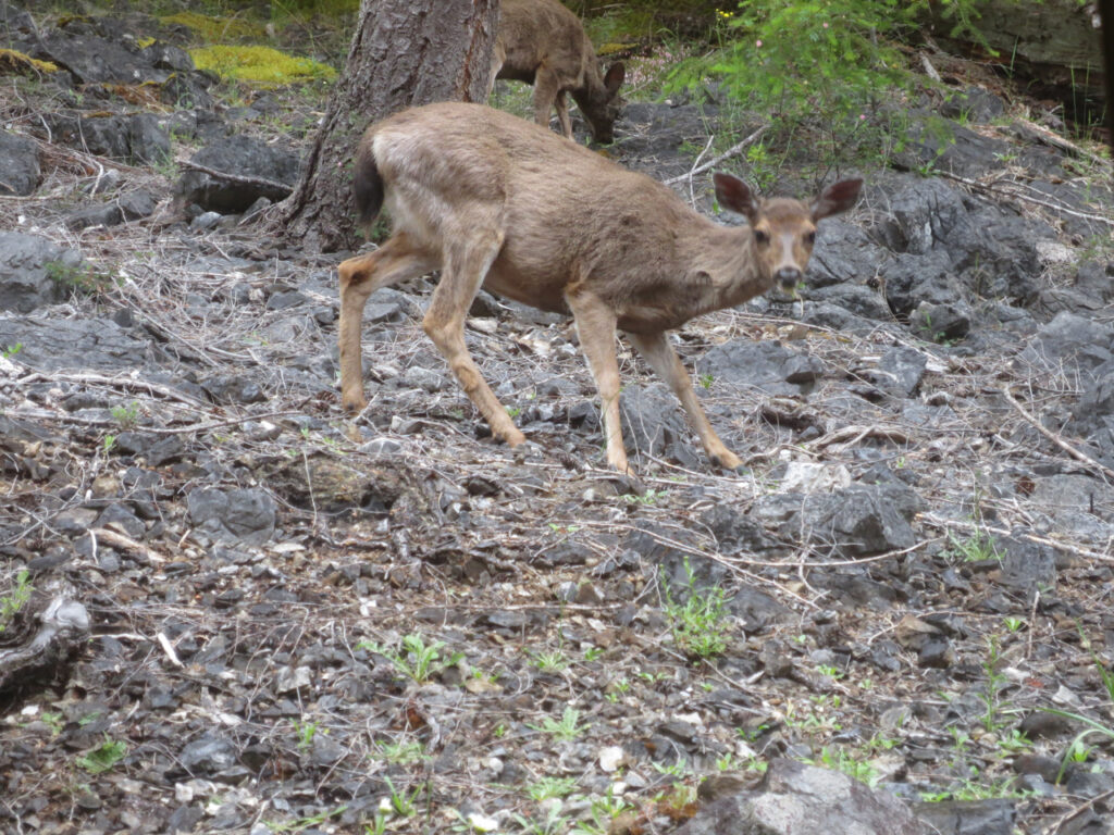 I was sitting at my desk cross stitching just now. It had just started to rain and I could hear it hitting the rooftop. When I looked out the window to see how hard the rain was coming down I saw a deer. When Pat was trying to see it from the bedroom window he spotted another one. It was hard to get the two of them in the same photo with the added problem of my camera battery running low. The one in the foreground is now laying on the grass under a tree; he’s possibly waiting for the rain to let up before they move on.