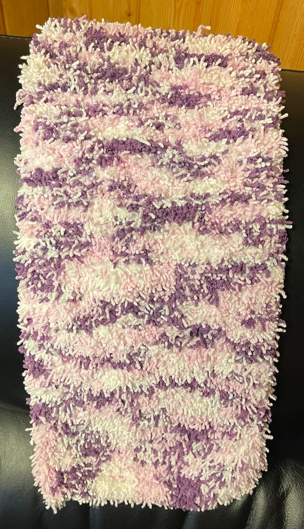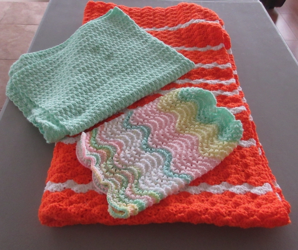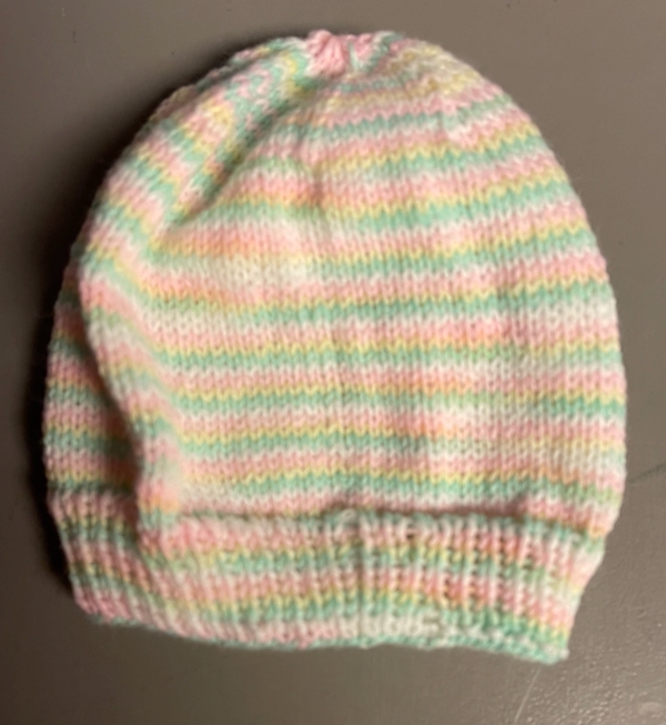 This summer I took a bag of baby yarn across and knit a baby cap. There was still plenty of yarn left so I knit another one. I think there is probably enough yarn left even now for at least three more. I’m sorry that this yarn is no longer available as I used it for all of the first blankies I made for my grandchildren.